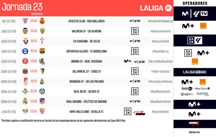 1月12日讯 西甲官方公布西甲第23轮比赛时间,皇马与马竞的马德里德比北京时间2月5日4点进行。