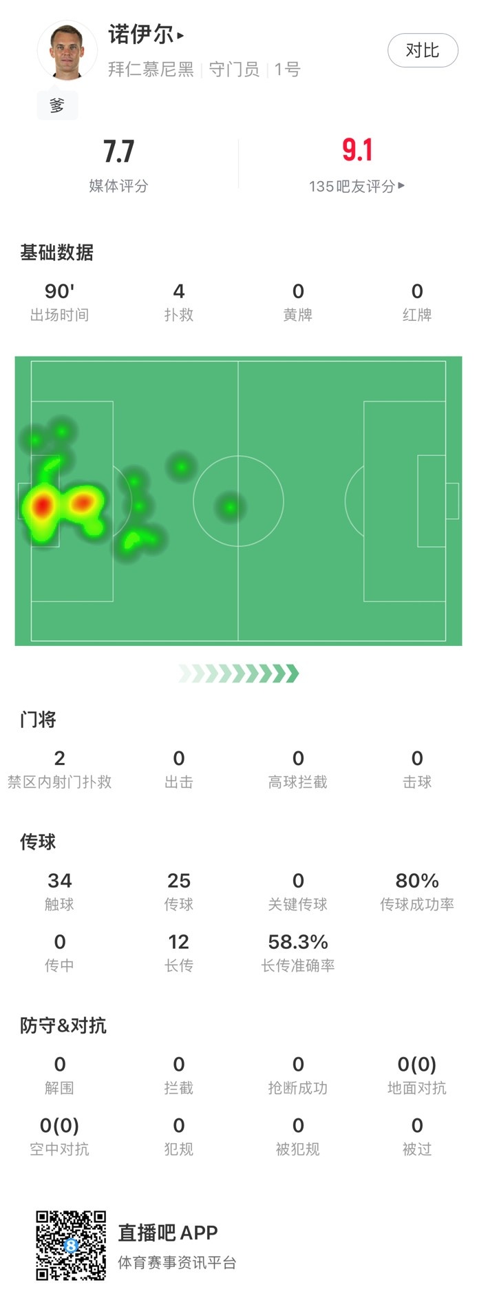 500场里程碑!诺伊尔全场数据:4次扑救,其中2次禁区内射门扑救