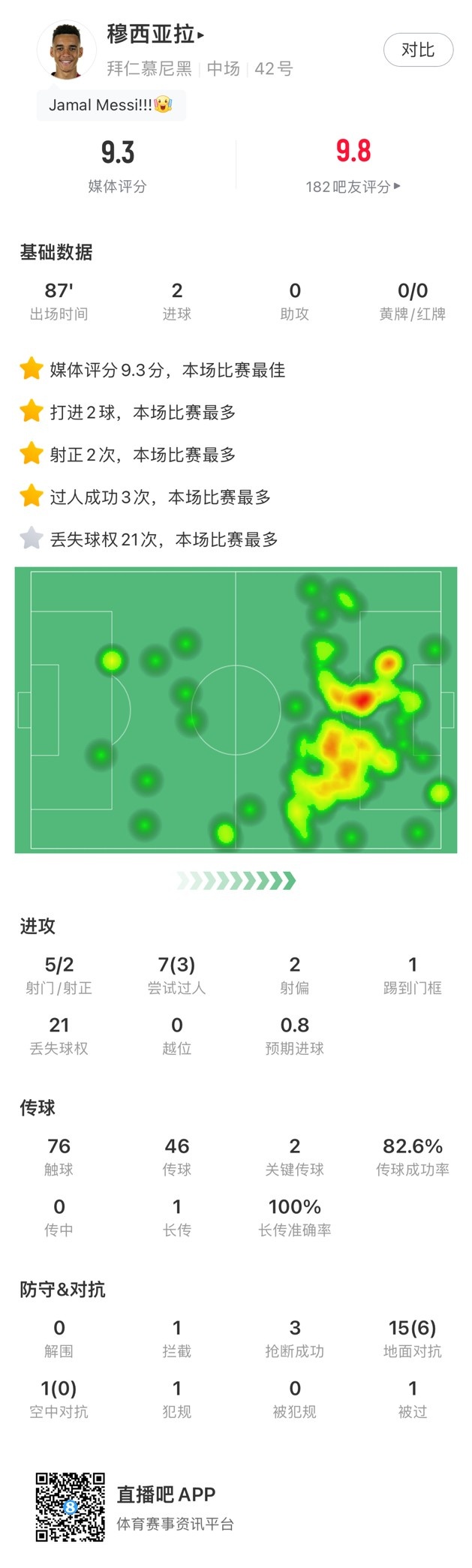 梅开二度,穆西亚拉数据:获评9.3分,过人等4项数据全场之最