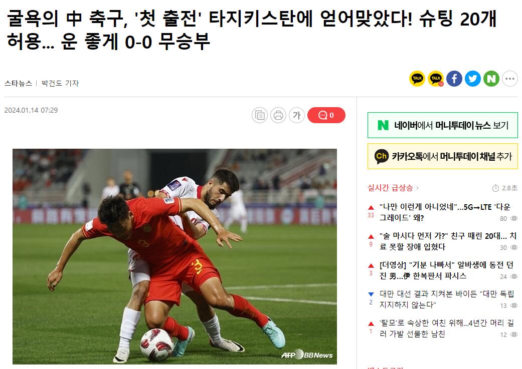 韩媒标题为“羞辱中国足球,被首次出战的塔吉克斯坦击败,被射门20次......幸运的是,结果是0-0平局”。