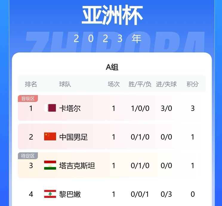 首轮卡塔尔3-0战胜黎巴嫩,国足0-0塔吉克斯坦。