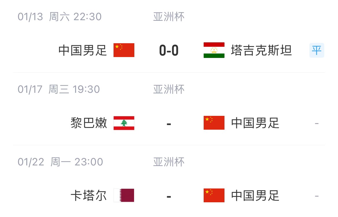 国足本届亚洲杯首战0-0打平塔吉克斯坦,下轮将战黎巴嫩。