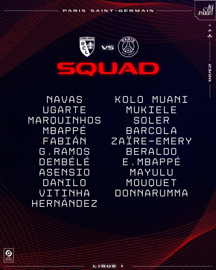 中场:乌加特、法比安、达尼洛-佩雷拉、维蒂尼亚、索莱尔、埃梅里、伊桑-姆巴佩、马尤卢