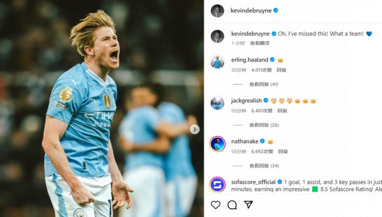 赛后,德布劳内更新了自己的社媒动态:噢我想念这个!多么出色的团队!