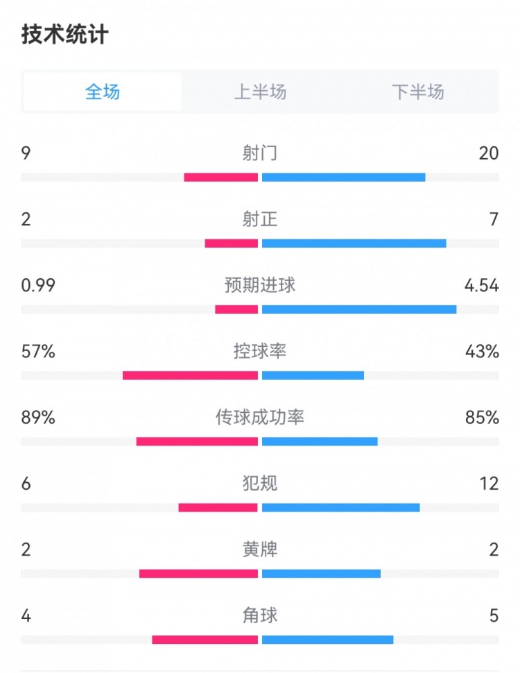 国米5-1蒙扎全场数据对比:射门20-9射正7-2,预期进球4.54-0.99