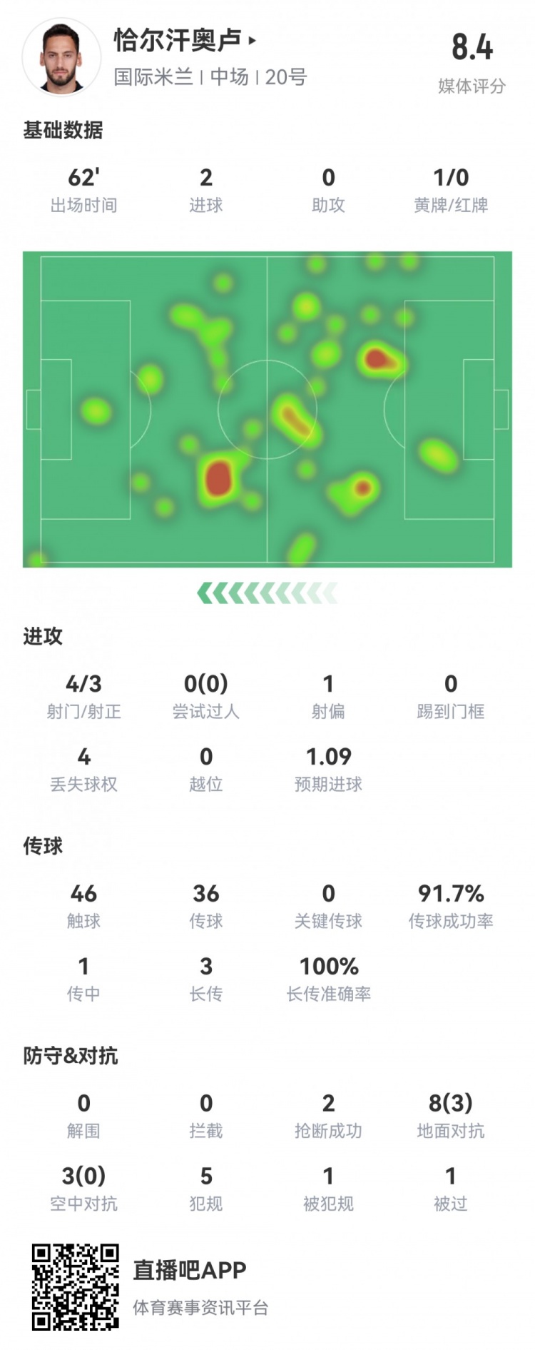 1月14日讯 本轮意甲,国米暂3-1领先蒙扎。此役恰尔汗奥卢发挥出色梅开二度,球员全场重点数据如下↓