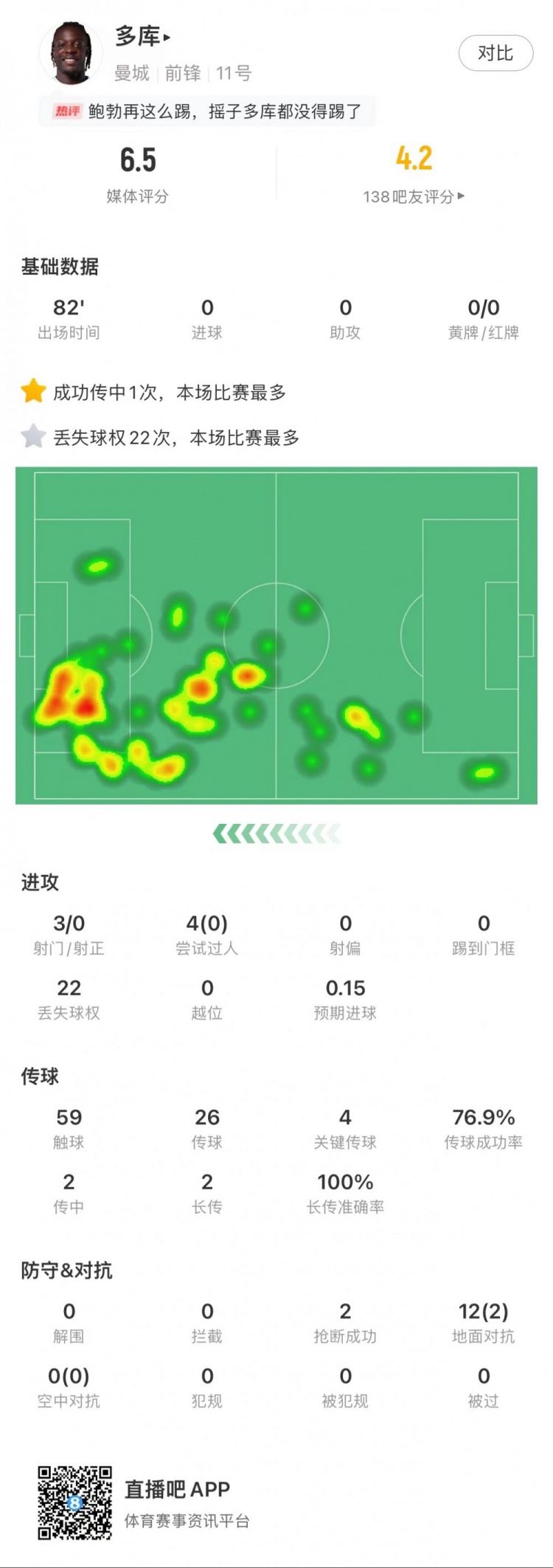 1月14日讯 英超第21轮,曼城客场3-2战胜纽卡。多库本场数据:59次触球传球成功率77%4次关键传球2次传中1次到位2次长传2次到位3次射门0次射正4次尝试过人0次成