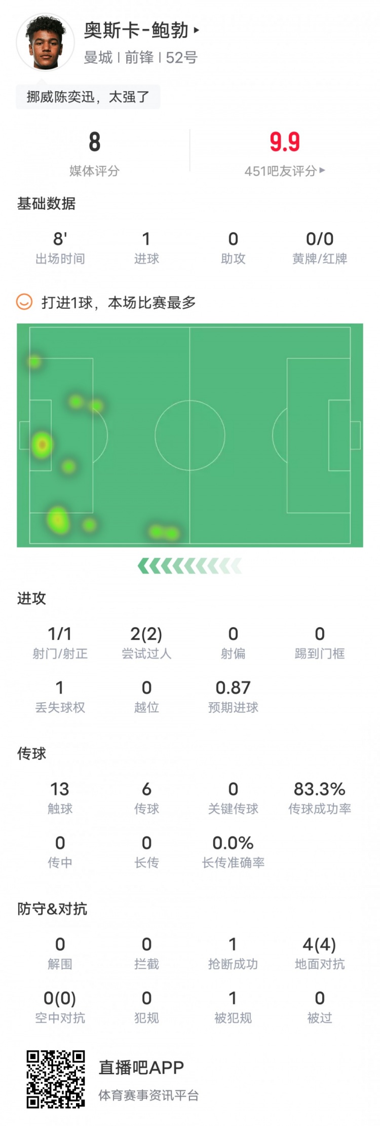 1月14日讯 在今日凌晨进行的一场英超联赛中,曼城3-2纽卡斯尔。本场比赛,曼城小将奥斯卡-鲍勃替补出战,打进绝杀进球,评分8.0。鲍勃本场比赛具体数据如下:上场时