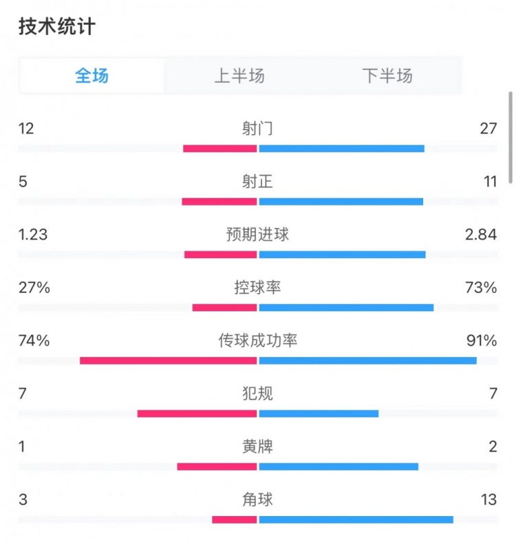 纽卡2-3曼城全场数据:射门12-27,射正5-11,黄牌:1-2