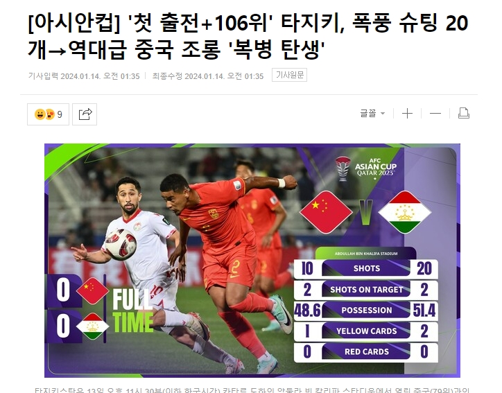 韩媒stnsports以“塔吉克‘首次亚洲杯出场+第106名’20次射门→史无前例,用射门嘲讽中国男足”为标题评价了这场比赛。