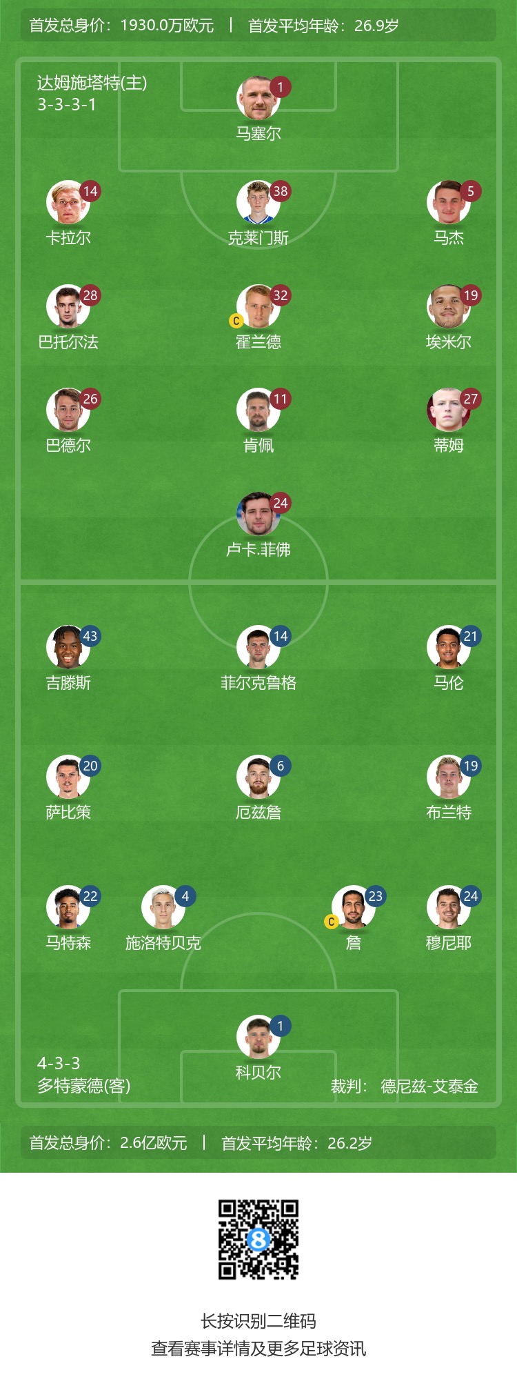 达姆施塔特首发:1-马塞尔、5-马杰、38-克莱门斯、14-卡拉尔、19-埃米尔、32-霍兰德、28-巴托尔法、27-蒂姆、11-肯佩、26-巴德尔、24-菲佛