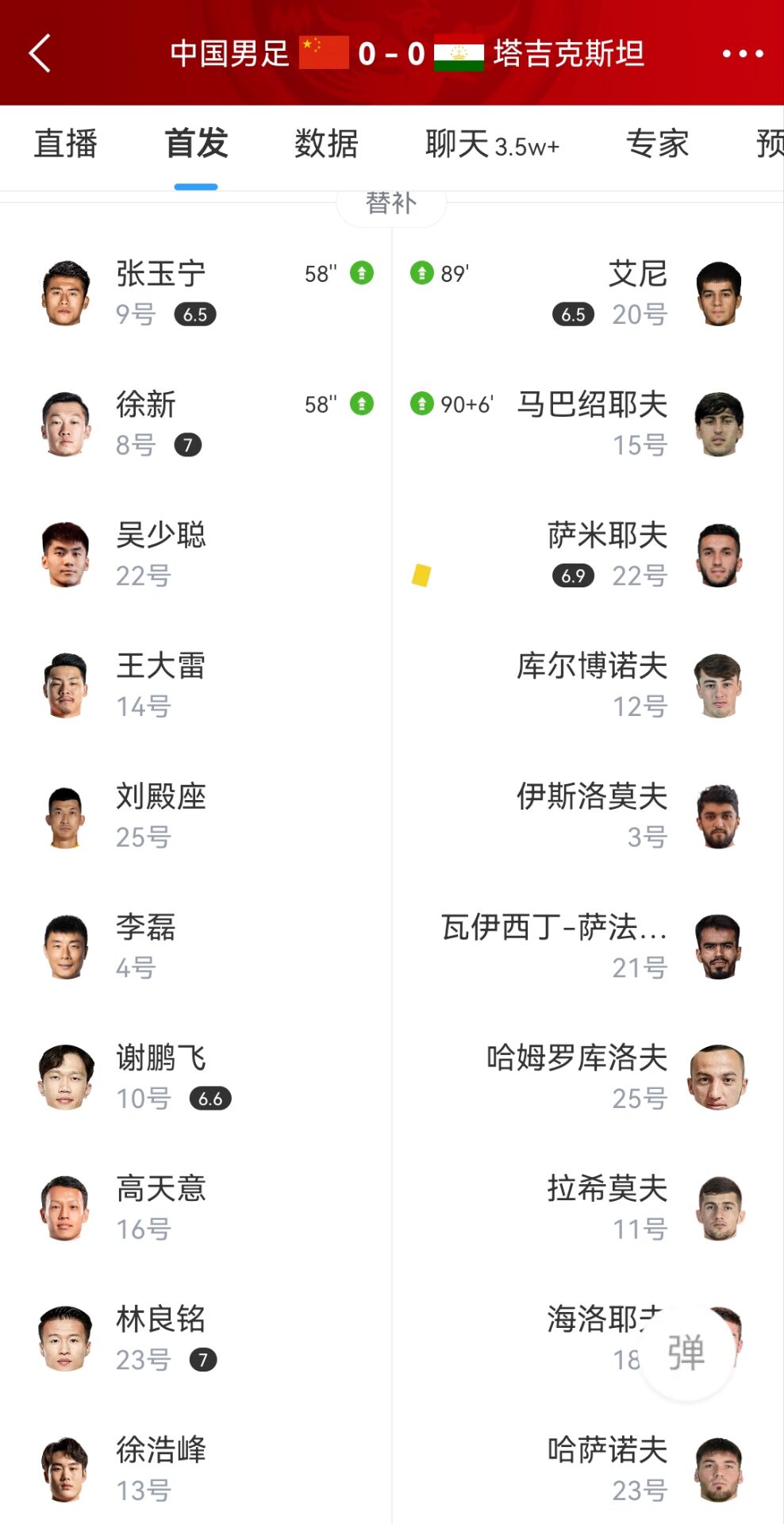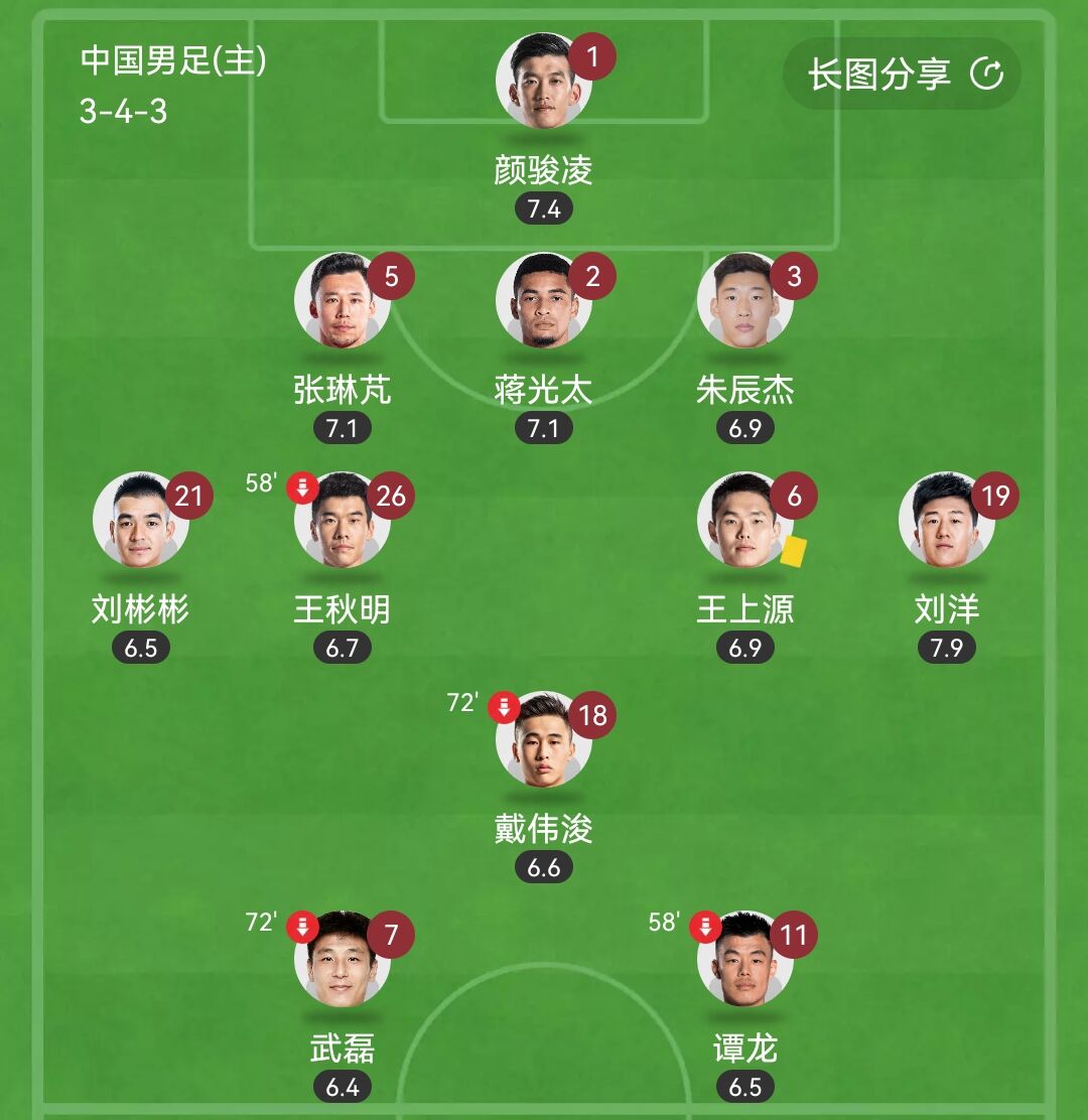 国足本场阵容:1-颜骏凌、2-蒋光太、3-朱辰杰、5-张琳芃、19-刘洋、6-王上源、18-戴伟浚(72’23-林良铭)、21-刘彬彬、26-王秋明(58’8-徐新)、7-武磊(72’10-谢鹏飞)、11-谭龙(58’9-张玉宁)
