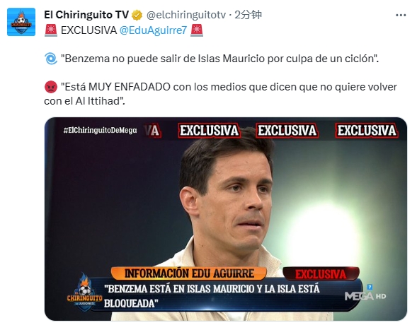 记者:因飓风本泽马被困毛里求斯,他对媒体称其不想归队愤怒