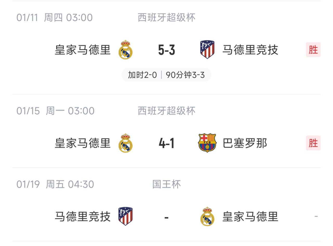 1月15日讯 西超杯决赛,皇马4-1巴萨队史第13次夺冠。皇马近期赛程,8天时间连战马竞、巴萨、马竞。