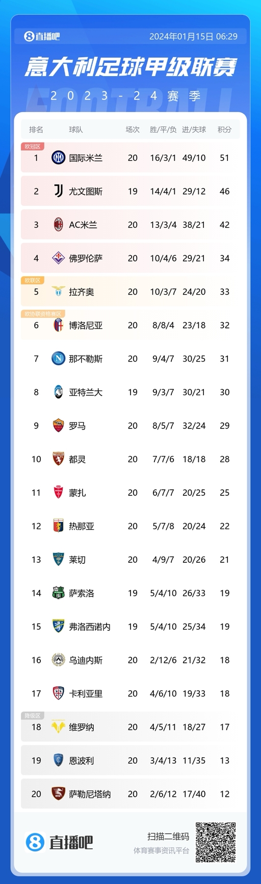 意甲积分榜:国米5分优势领跑,米兰第三,罗马第九
