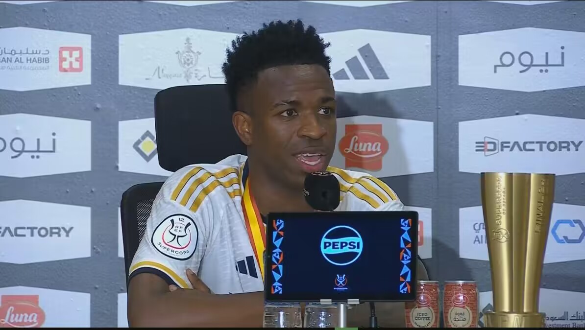 1月15日讯 西超杯决赛,皇马4-1巴萨队史第13次夺冠。此役维尼修斯完美发挥半场即上演帽子戏法。赛后他也出席发布会回答了记者的问题。
