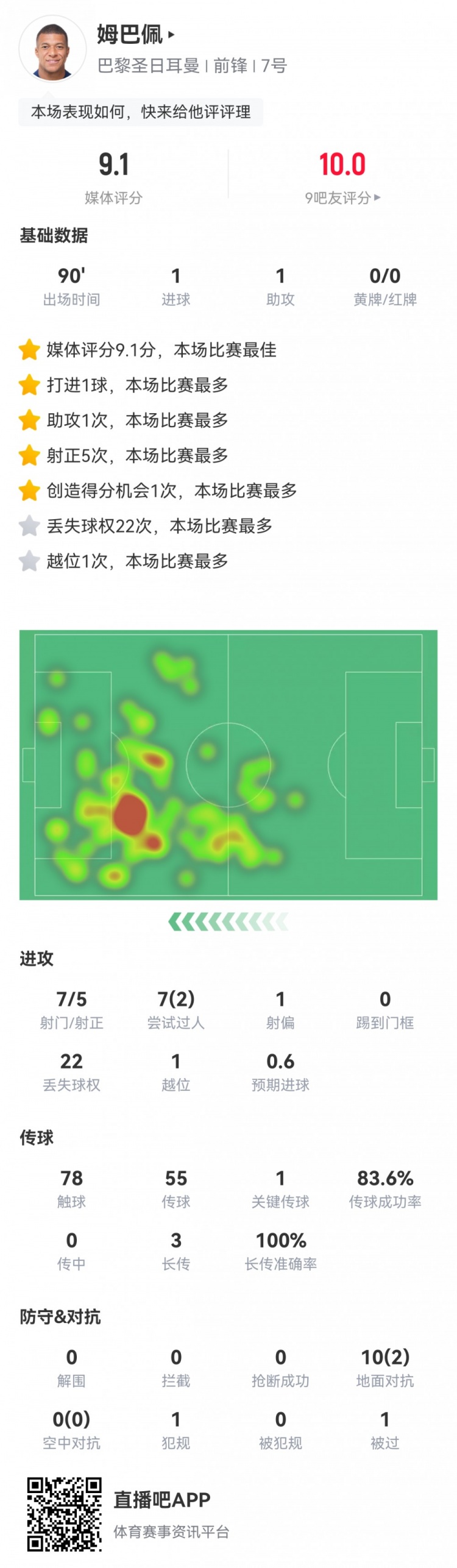 姆巴佩本场数据:传射建功,1次关键传球,获评全场最高9.1分