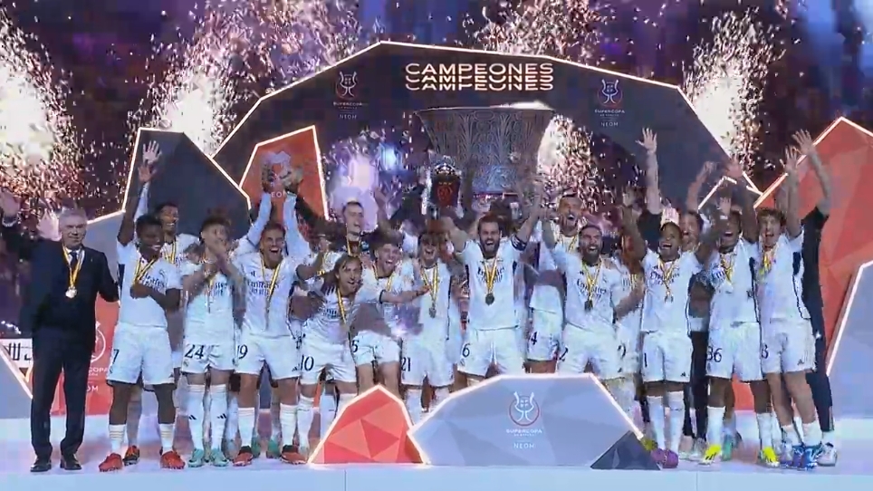 捧杯时刻!2024年第一冠!纳乔举起皇马队史第13座西超杯