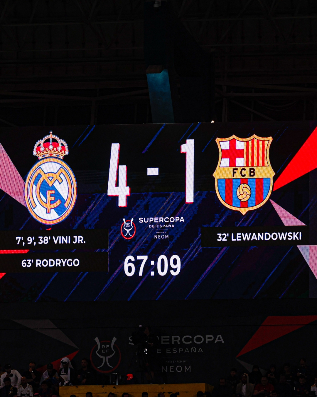 01月15日讯 西班牙超级杯决赛,皇马4-1击败巴萨,夺得队史第13座西超杯冠军。赛后,皇马官推晒出比分牌“皇马67分钟4-1巴萨”,并配上“