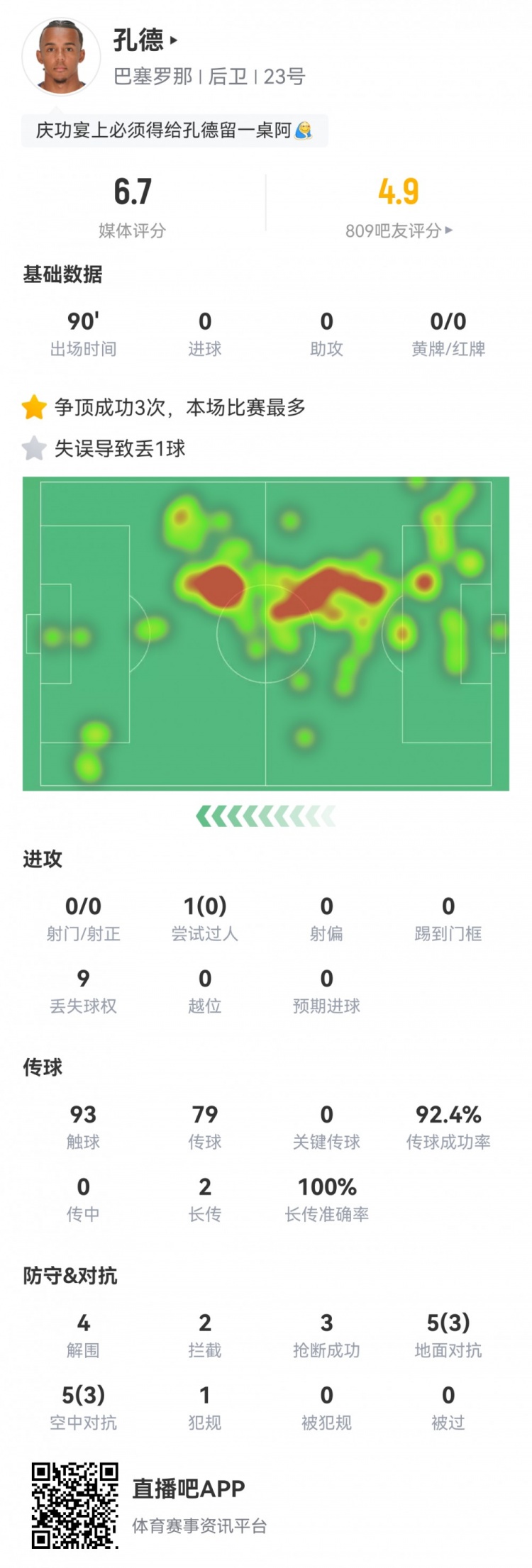 状态不佳!孔德全场数据:4次解围,9次丢失球权,获评6.7分