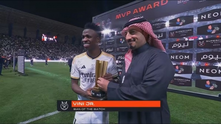 1月15日讯 西超杯决赛,皇马4-1巴萨队史第13次夺冠。此役维尼修斯完美发挥半场即上演帽子戏法,赛后他也当选全场最佳球员。(南川源)