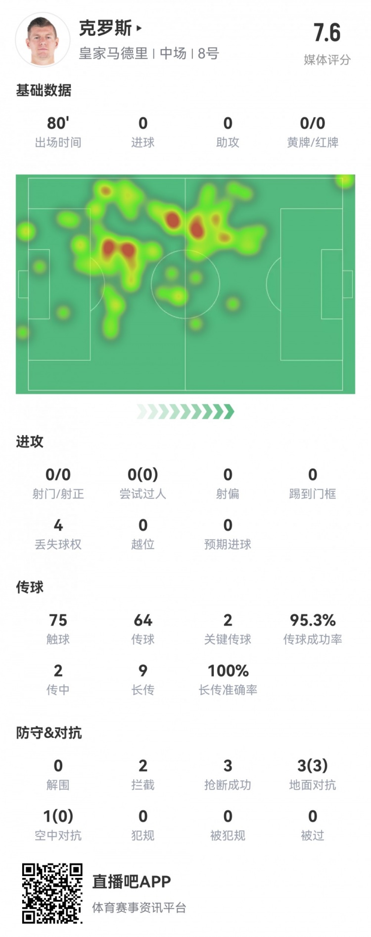 克罗斯数据:传球成功率95%,9次长传全部成功,获评7.8分