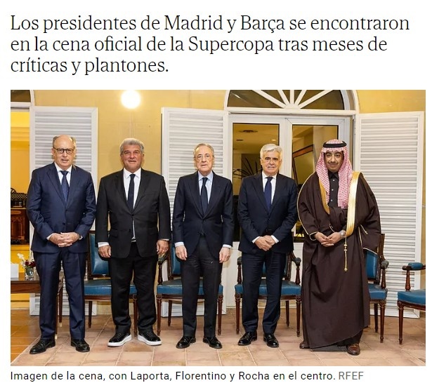 在西超杯决赛前,双方主席都出席了西班牙驻沙特大使馆举办的官方晚宴。据西媒报道,这是自2023年3月2日在伯纳乌进行的国王杯半决赛首回合后,老佛爷和拉波尔塔的首次公开会面。内格雷拉的事件让双方关系紧张,老佛爷决定不在去年3月、4月随队出战客战巴萨的联赛和国王杯次回合。本赛季,老佛爷也没有现身蒙锥克现场督战首回合的国家德比。