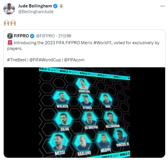随后,首次入选FIFA年度最佳阵容的贝林厄姆转发了最佳阵容图片的推文。