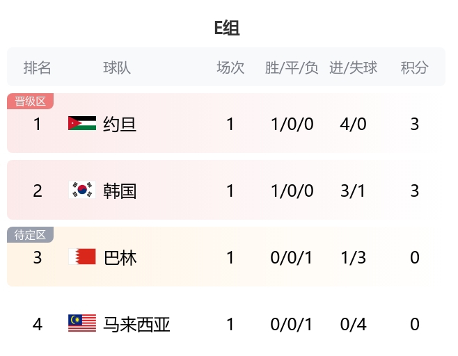 积分榜方面,约旦3分位居第一,韩国暂居第二,巴林第三,马来西亚垫底。