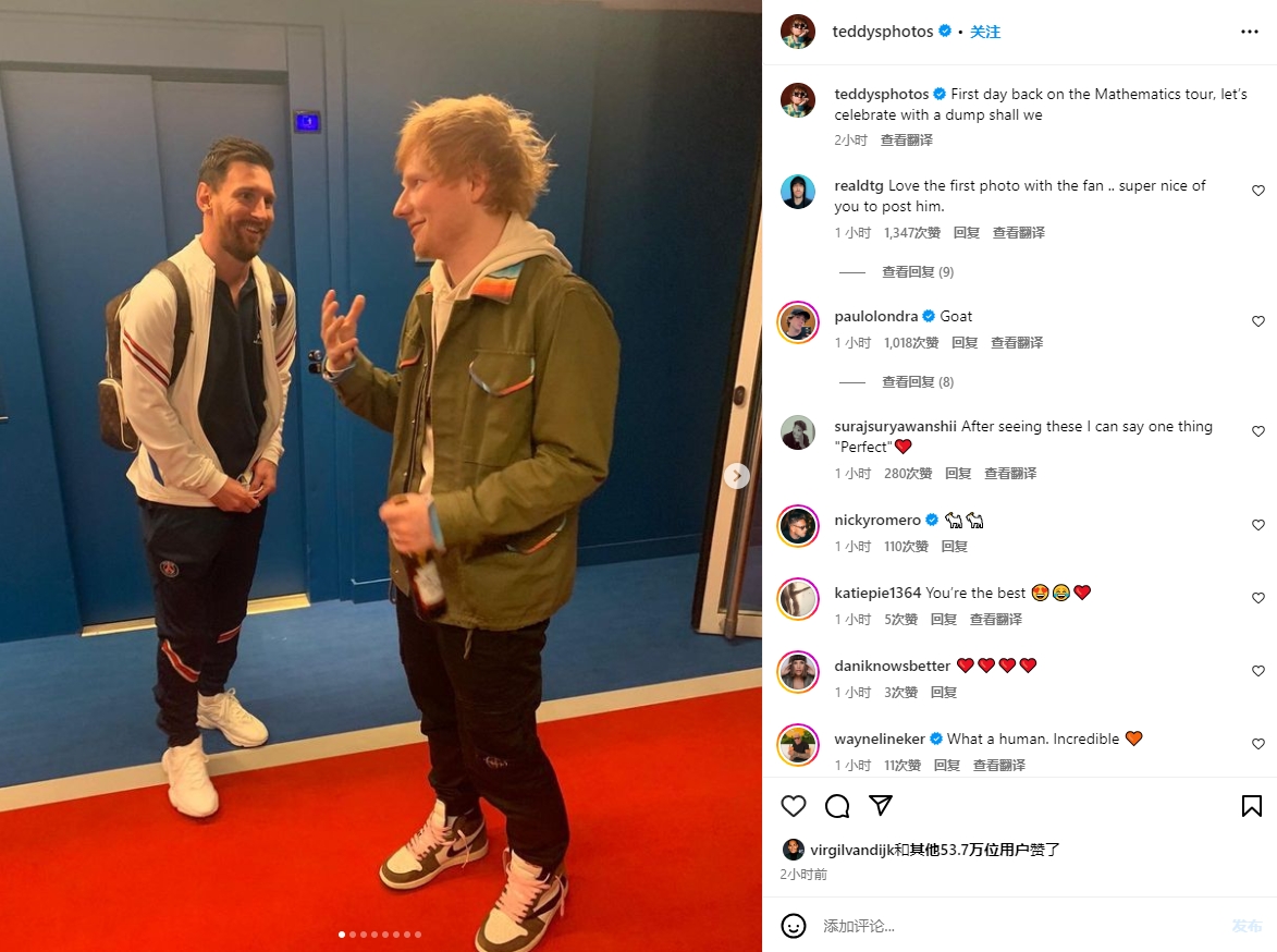 1月16日讯 著名歌手“黄老板”艾德-希兰更新了自己的社媒动态,晒照回顾了自己的世界巡演Mathematics tour。黄老板这则动态有8张照片,他使用了和梅西的同框