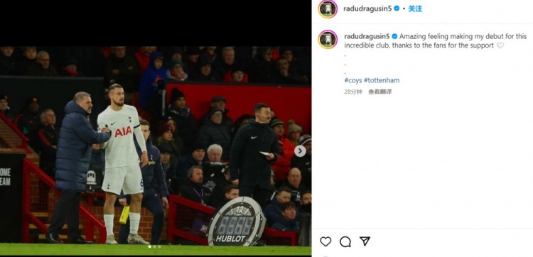 1月16日讯 英超第21轮,德拉古辛替补登场,热刺客场2-2曼联。本场比赛过后,上演热刺首秀的德拉古辛更新了社媒动态:“为这支不可思议的俱乐部首秀感觉很棒,感谢球