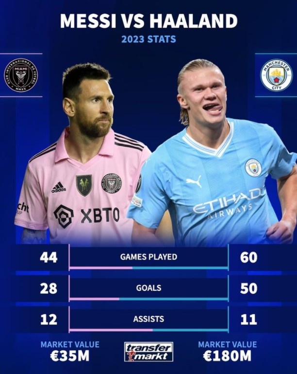 2023年,梅西出战44场比赛,贡献28球12次助攻,德转当前身价3500万欧;哈兰德出战60场比赛,贡献50球11次助攻,德转当前身价1.8亿欧。