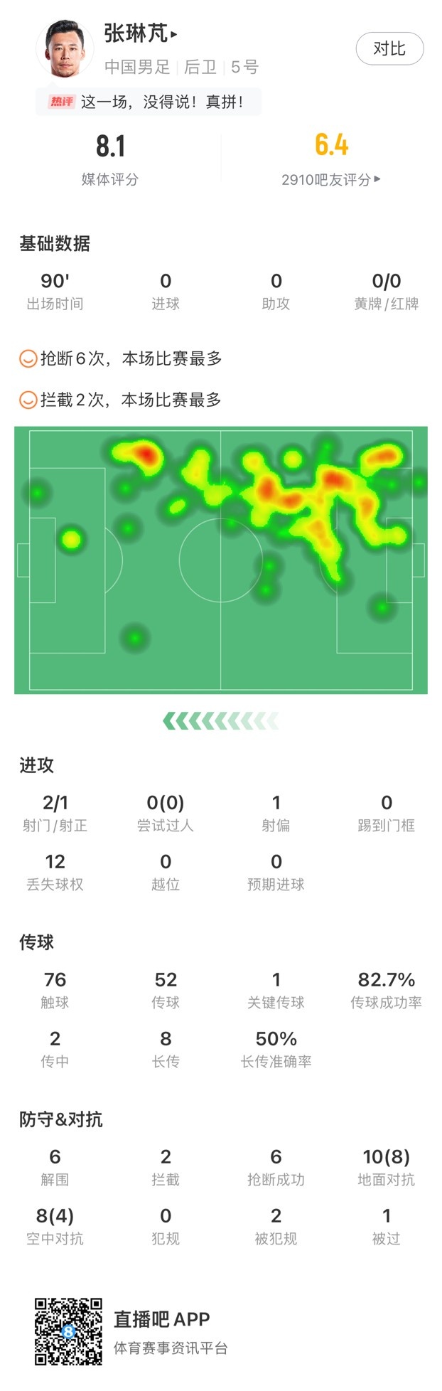 张琳芃获评8.1分,抢断6次、拦截2次均为全场最高