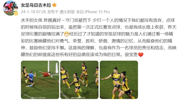 1月18日讯 在澳大利亚女足超级联赛中,中央海岸水手女足2-1击败悉尼女足,中国留洋球员乌日古木拉首发打满全场,并在第99分钟上演绝杀。赛后,乌日古木拉发长文庆