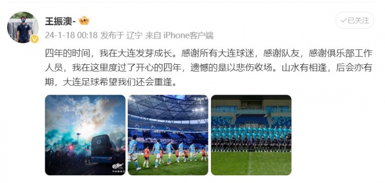 1月18日讯 昨天,大连人足球俱乐部宣布停止运营。大连人球员王振澳发文感谢大连球迷、队友。