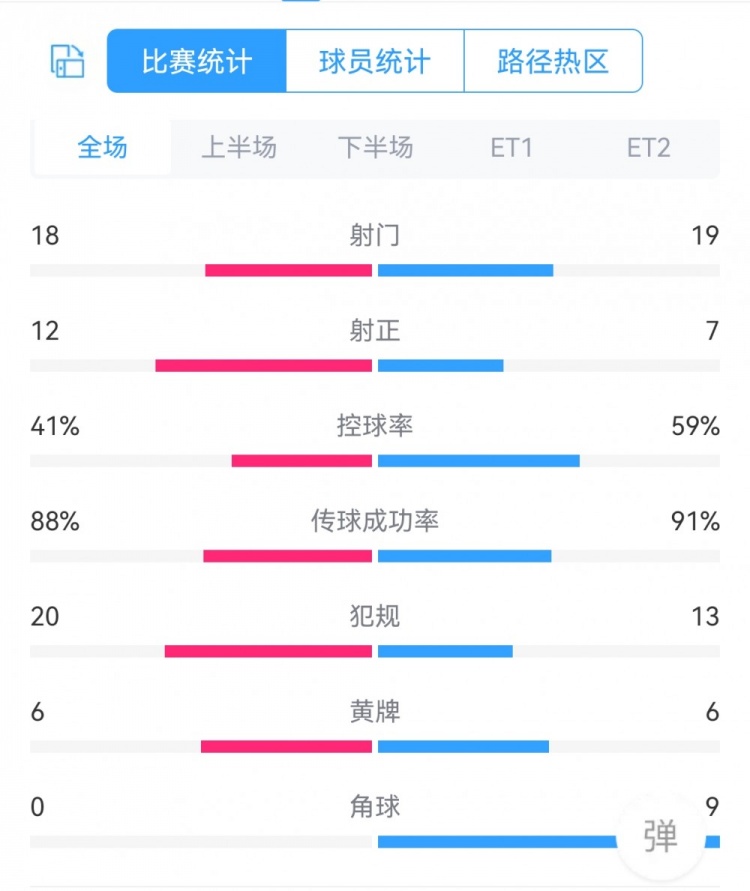 1月19日讯 国王杯马竞加时鏖战4-2复仇皇马晋级8强,双方全场数据对比如下↓(马竞在前)射门18-19射正12-7控球率41%-59%传球成功率88%-91%犯规20-13黄牌6-6角球