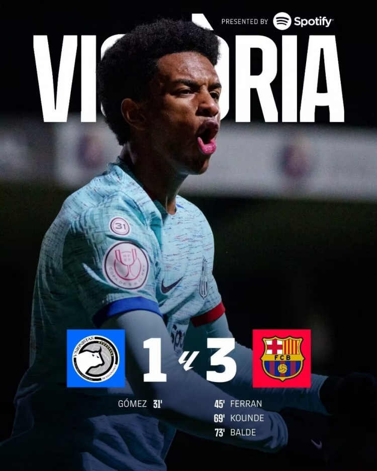 国王杯赛场,巴萨3-1逆转低级别球队尤尼恩斯塔斯,费兰、孔德和巴尔德各入一球。