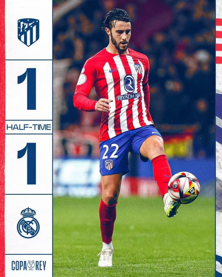 1月19日讯 国王杯1/8决赛,马竞对阵皇马。上半场,贝林厄姆1V3个人秀中框,利诺破门,补时阶段奥布拉克出击失误乌龙送礼皇马扳平比分。半场战罢,皇马暂1-1马竞。