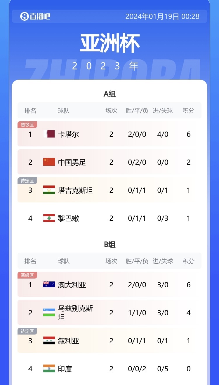 1月19日讯 男足亚洲杯A、B组前两轮战罢,积分形势如上。