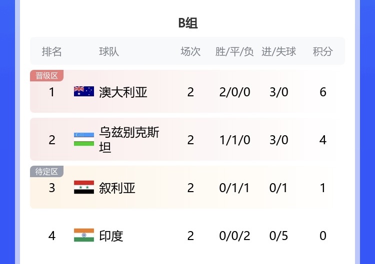 亚洲杯B组积分榜:澳大利亚6分 乌兹别克4分 叙利亚1分 印度0分