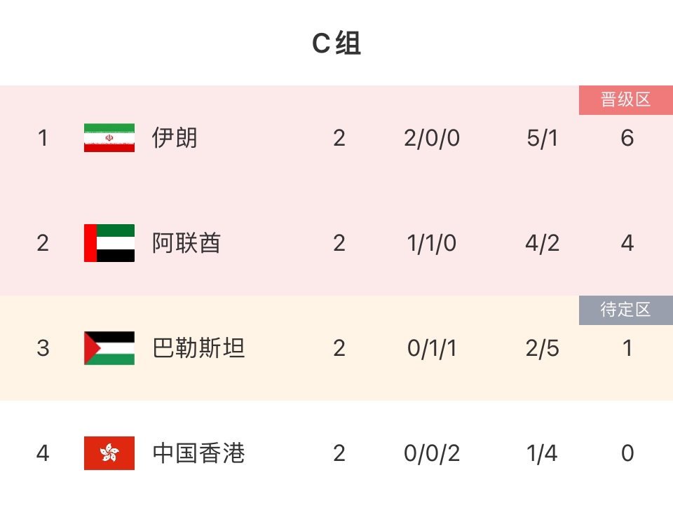 积分榜上,阿联酋4分第二,巴勒斯坦1分第三,中国香港0分垫底。