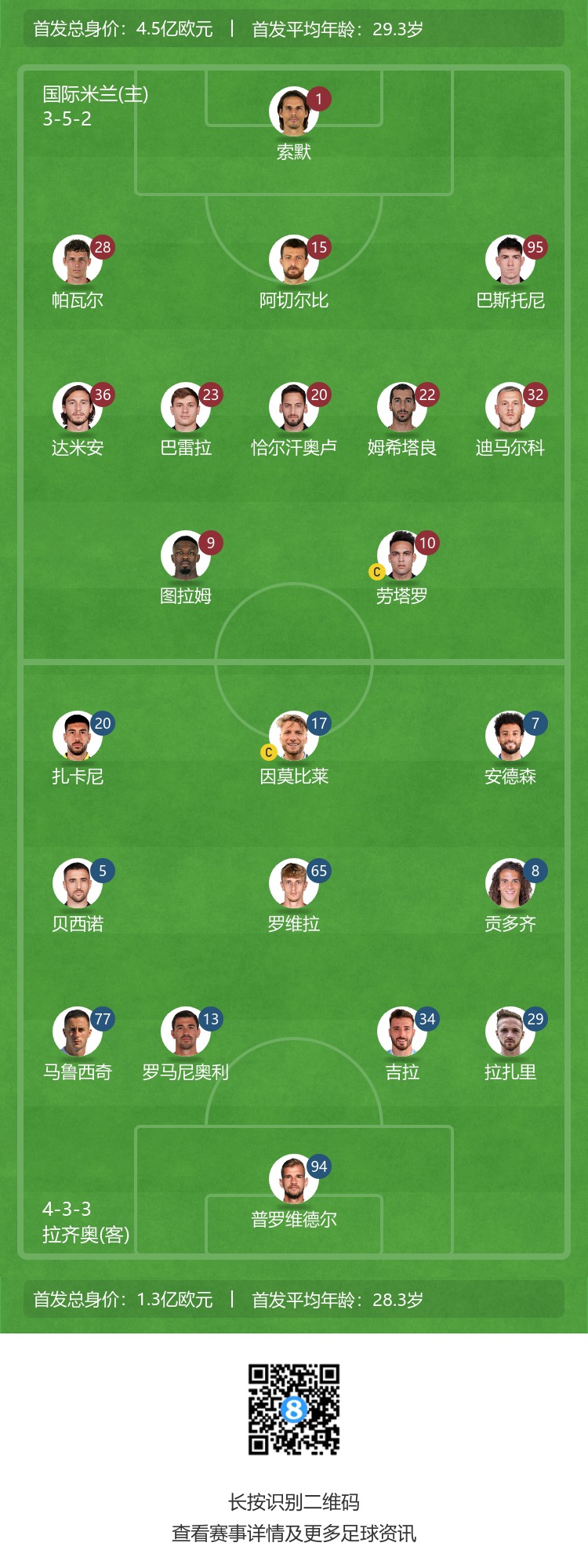 意超杯-国米vs拉齐奥首发:劳塔罗搭档图拉姆,因莫比莱先发