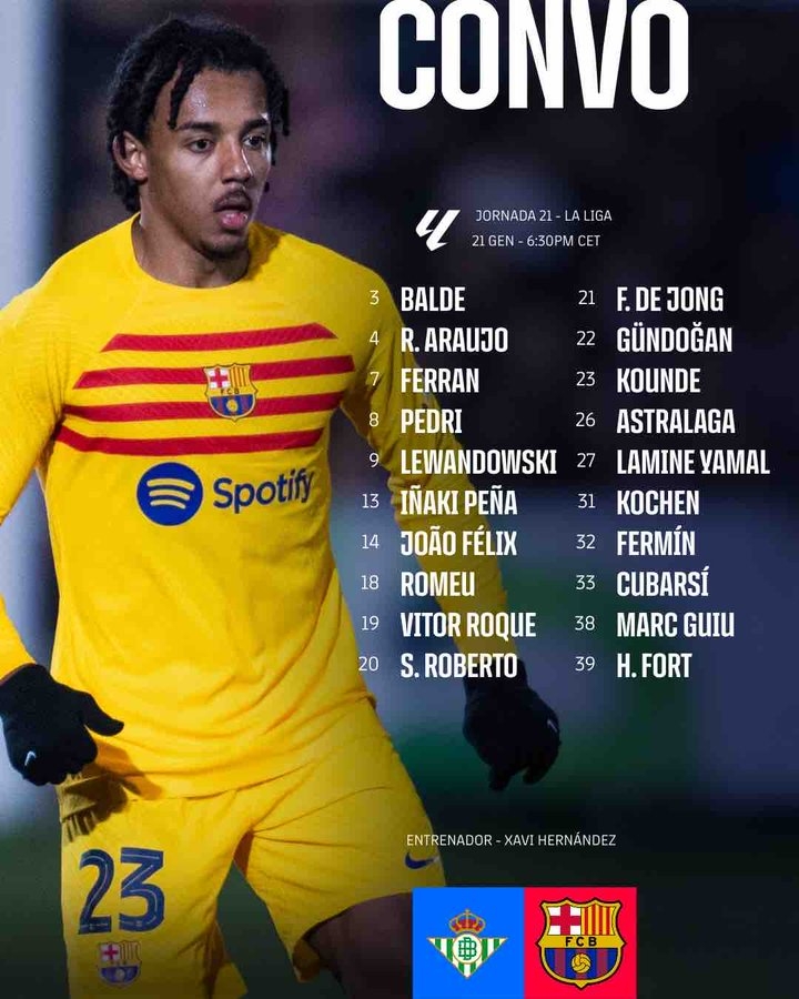 巴萨vs贝蒂斯大名单:滕森&坎塞洛缺席,莱万领衔,阿劳霍在列