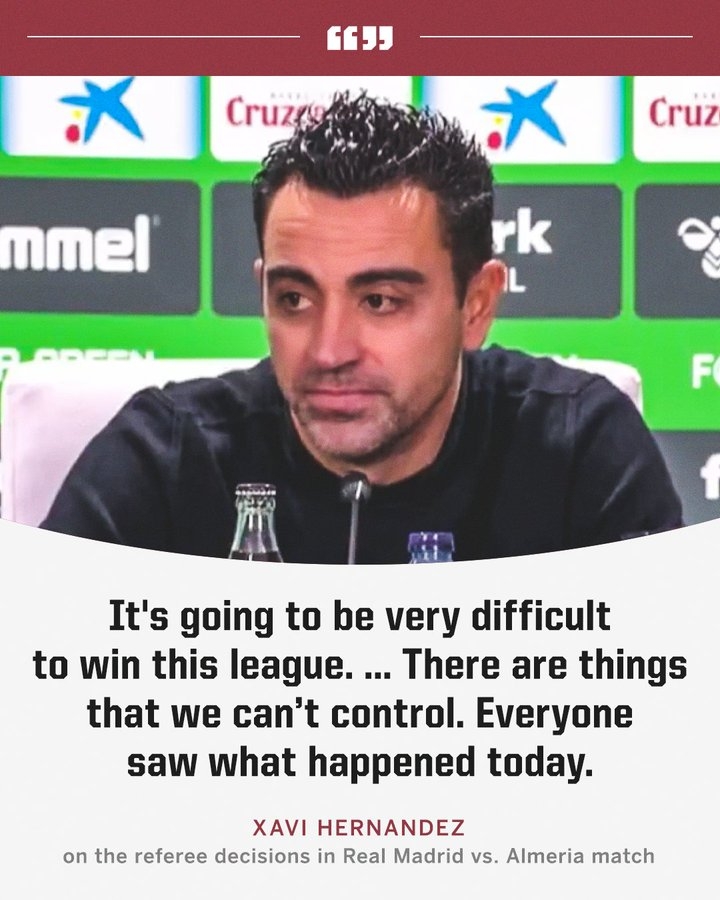 哈维:我同意阿尔梅里亚主帅的看法,还有雷拉诺(该记者表示这场比赛的裁判非常糟糕),他是一个非常棒的记者。我在赫塔费的比赛之后就说过,赢得这个联赛很难。有些人都已经忘了,但是我想我们本应该再多拿6分。我还记得有一个点球、对拉菲尼亚的犯规,菲利克斯对阵格拉纳达的进球,这些不是借口,这是事实,95分钟时总是发生很多情况。为了继续我的工作,我们还剩下18场比赛,我们已经尽力了。有些事情是我们无法控制的,今天发生了什么每个人都看到了。