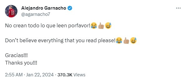 1月22日讯 加纳乔更新个人社媒,发文:请不要相信你读到的任何事情!