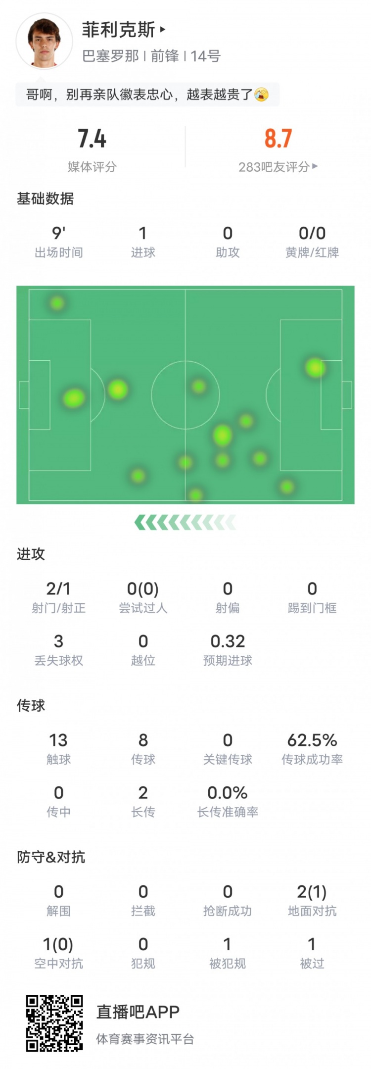 1月22日讯 在4-2击败贝蒂斯的比赛中,巴萨攻击手菲利克斯替补出战,打进1球,帮助球队超出比分,赛后评分7.4。菲利克斯本场比赛具体数据如下:上场时间9分钟进球1射