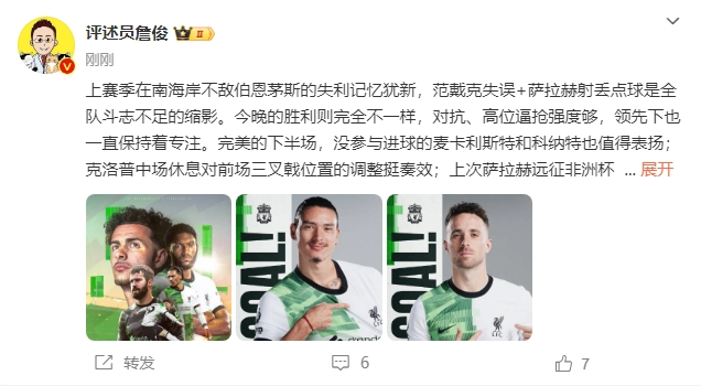 詹俊:上赛季在南海岸不敌伯恩茅斯的失利记忆犹新,范戴克失误+萨拉赫射丢点球是全队斗志不足的缩影。今晚的胜利则完全不一样,对抗、高位逼抢强度够,领先下也一直保持着专注。完美的下半场,没参与进球的麦卡利斯特和科纳特也值得表扬;克洛普中场休息对前场三叉戟位置的调整挺奏效;上次萨拉赫远征非洲杯的时候若塔就发挥了重要作用,这次也不例外,本场MVP!!