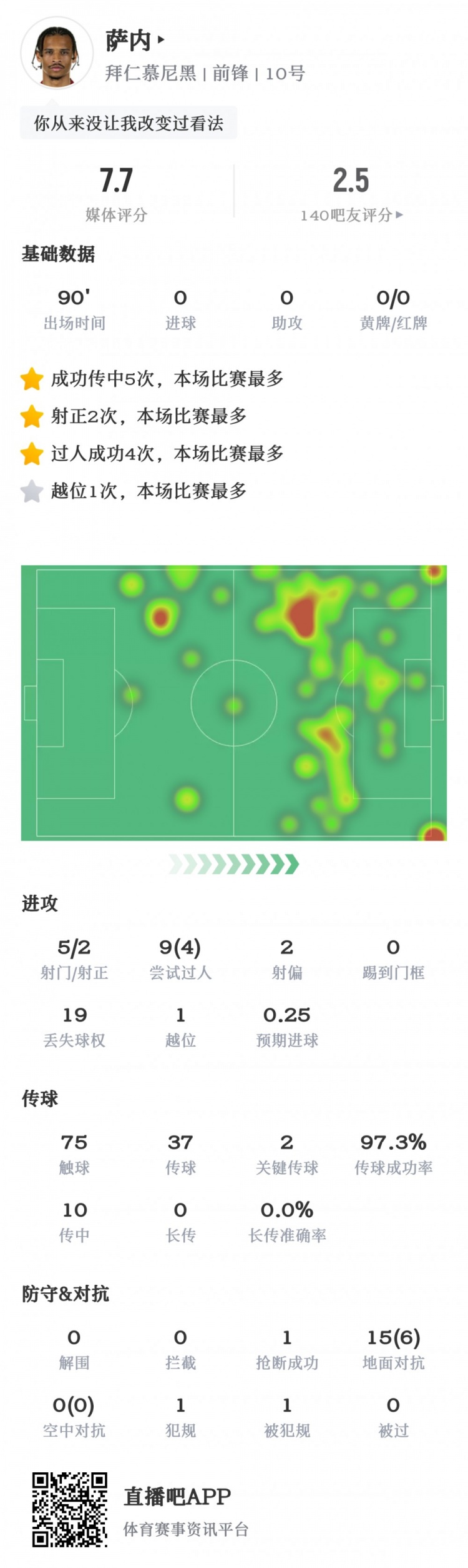 白忙活!萨内数据:2射正&2关键传球,19次失球权,获评7.7分