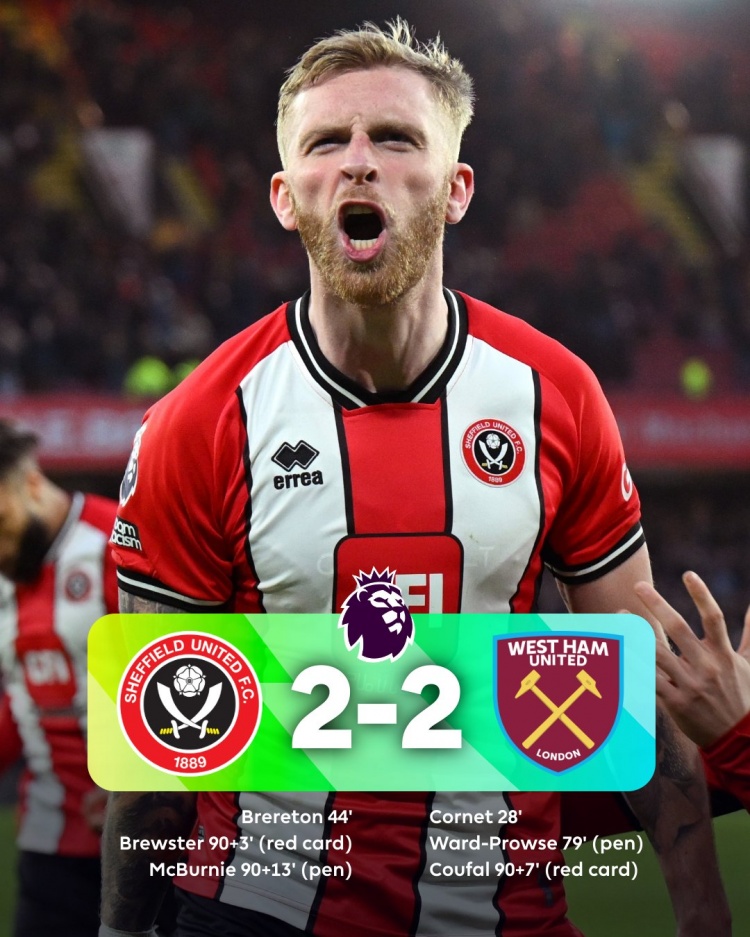 第93分钟,谢菲联球员布鲁斯特吃到红牌,西汉姆球员曹法尔第97分钟吃到红牌。第103分钟,麦克伯尼点射助谢菲联绝平,这也是有记录以来英超最晚时间进球。