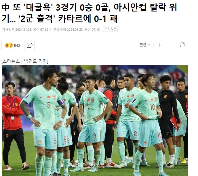 1月23日讯 亚洲杯小组赛第三轮,国足0-1不敌卡塔尔。韩媒naver点评,称中国足球遭遇“奇耻大辱”,三场比赛0胜0球。韩媒称,中国队小组赛三场比赛未打进一球,未取